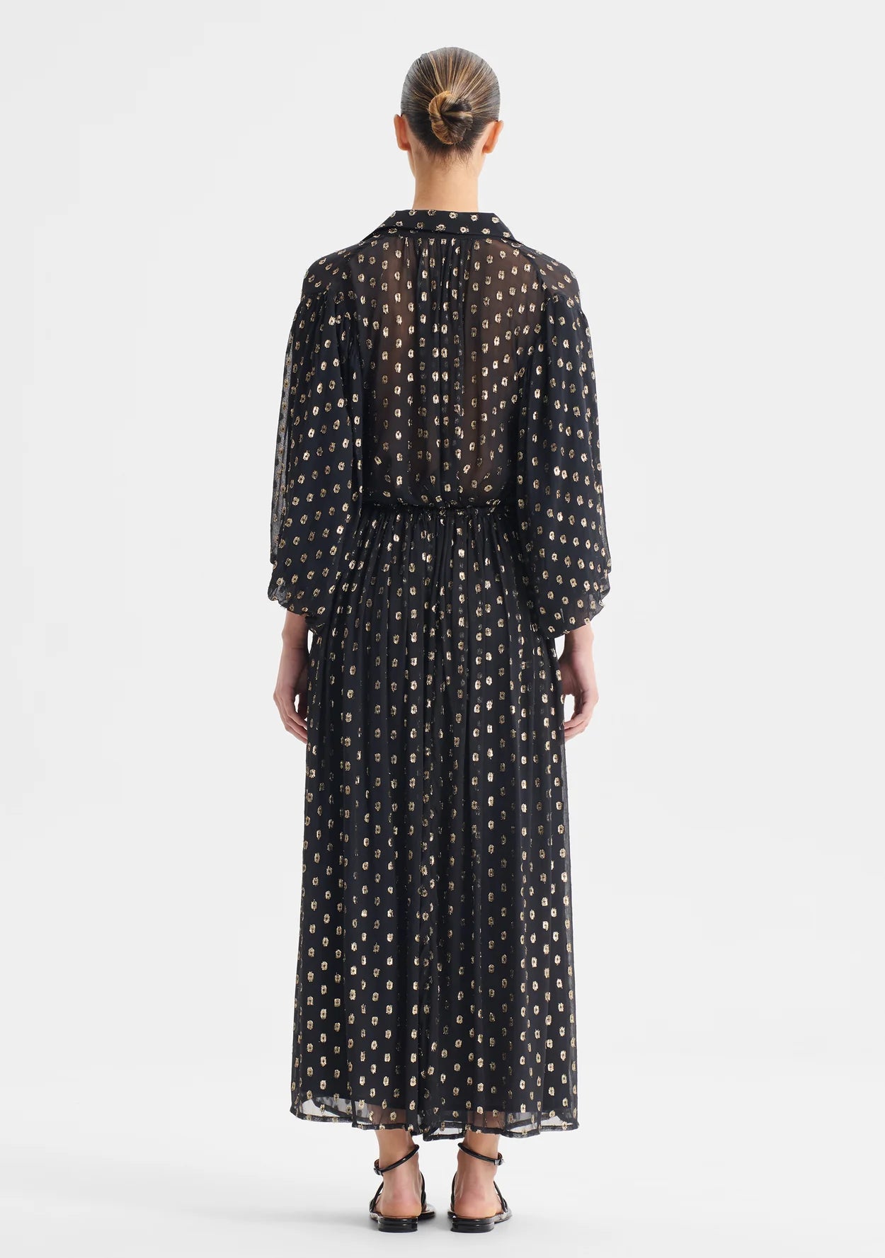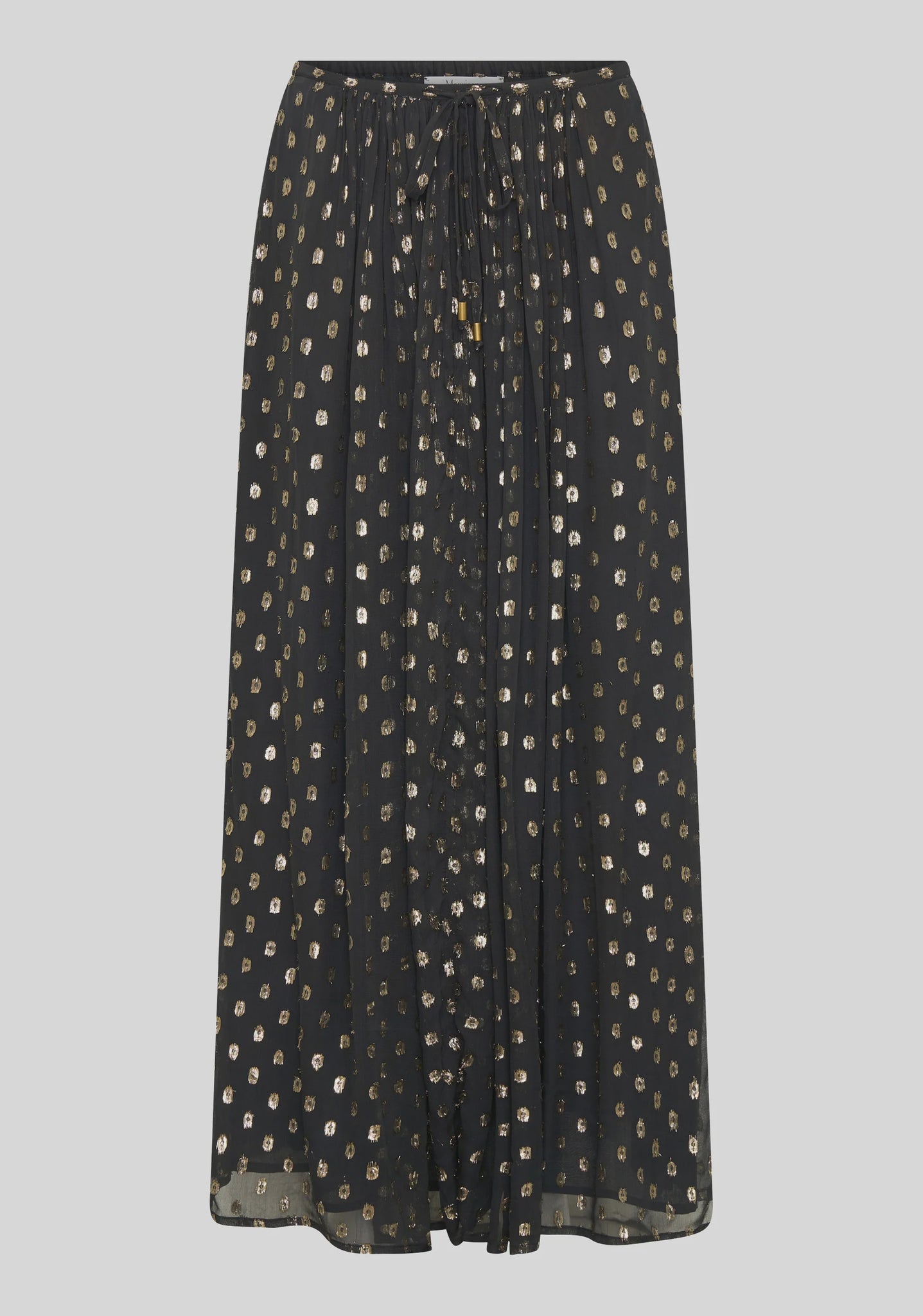 Cecile Skirt is crafted from shimmering gold lurex georgette, offering a soft, fluid drape. Designed with a gathered waistline and elasticised back with adjustable drawcord, it ensures comfort and flexibility. The midi length swing silhouette moves beautifully with every step and is fully lined for a polished finish.